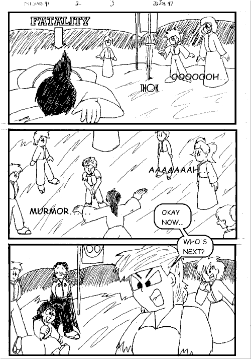 1. It will be explained in-comic later, but Scott has found himself suddenly teleported to feudal Japan circa 1400-1500 or so. His location should explain why there has thus far been only two natives of the area (out of several) with dark hair. Or at least it would explain it if you are David Gonterman. 2. Thank you, David, for pointing out, Mortal Kombat-style, that a FATALITY has occurred. The basketball-sized hole in the person's back was not enough of an indication. 3. A brief forensic analysis of what has happened thus far will explain Scott's hostile attitude here: He has found himself transported into a land where the background may or may not be about eighty different things, only to find a man with a sword, whom he promptly shot in the chest at point blank range with a .44. Despite doing this, there was no blood spray and there is no blood on the ground at all, in fact. Additionally, although he was shot in the chest while in the air, the man landed face down. To put a cap on all this, the exit wound seems to have disappeared and the man's pants have changed color from dark to light, as opposed to the other way round, which would have been expected. You'd be pretty irate, too. |
